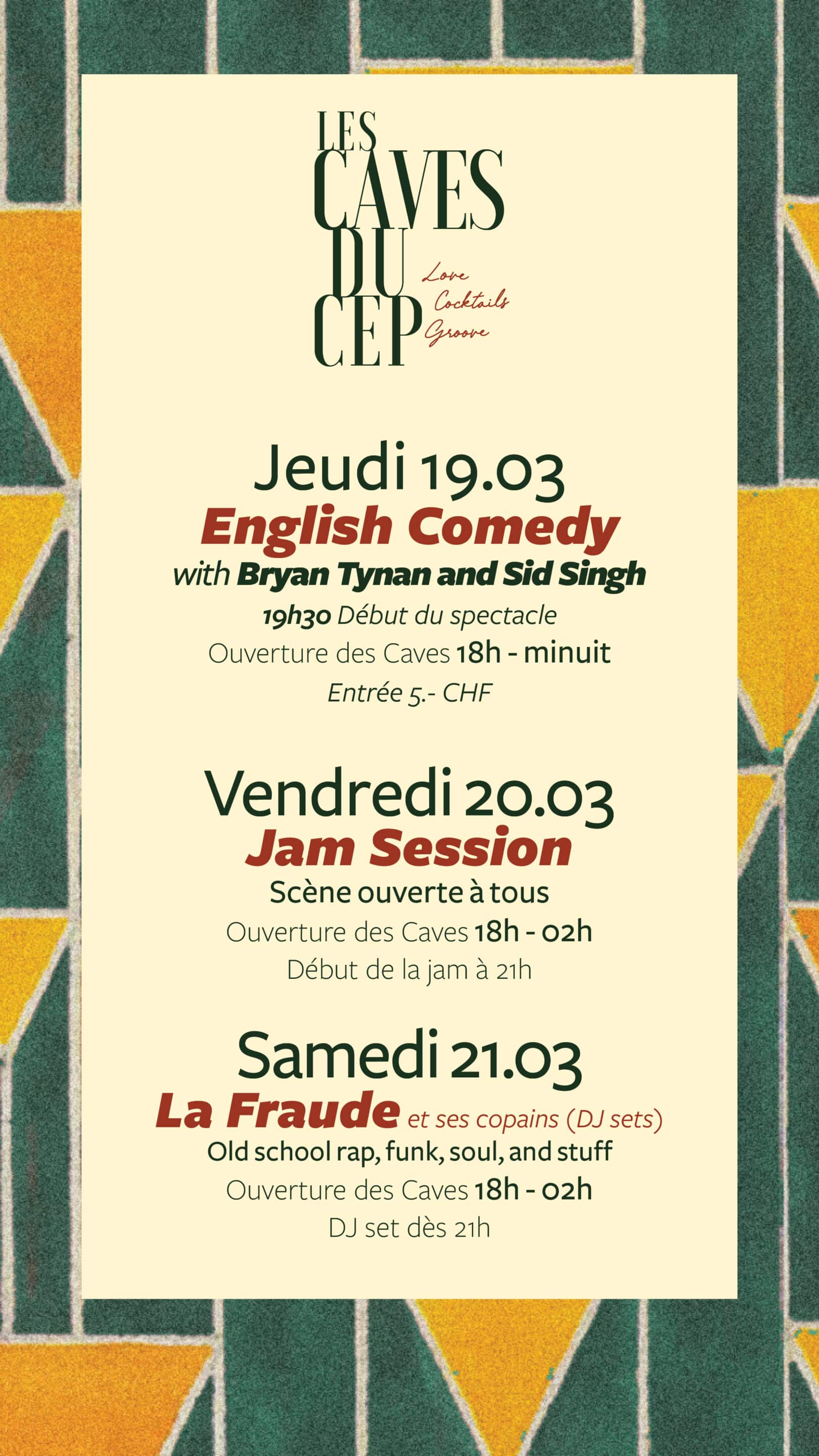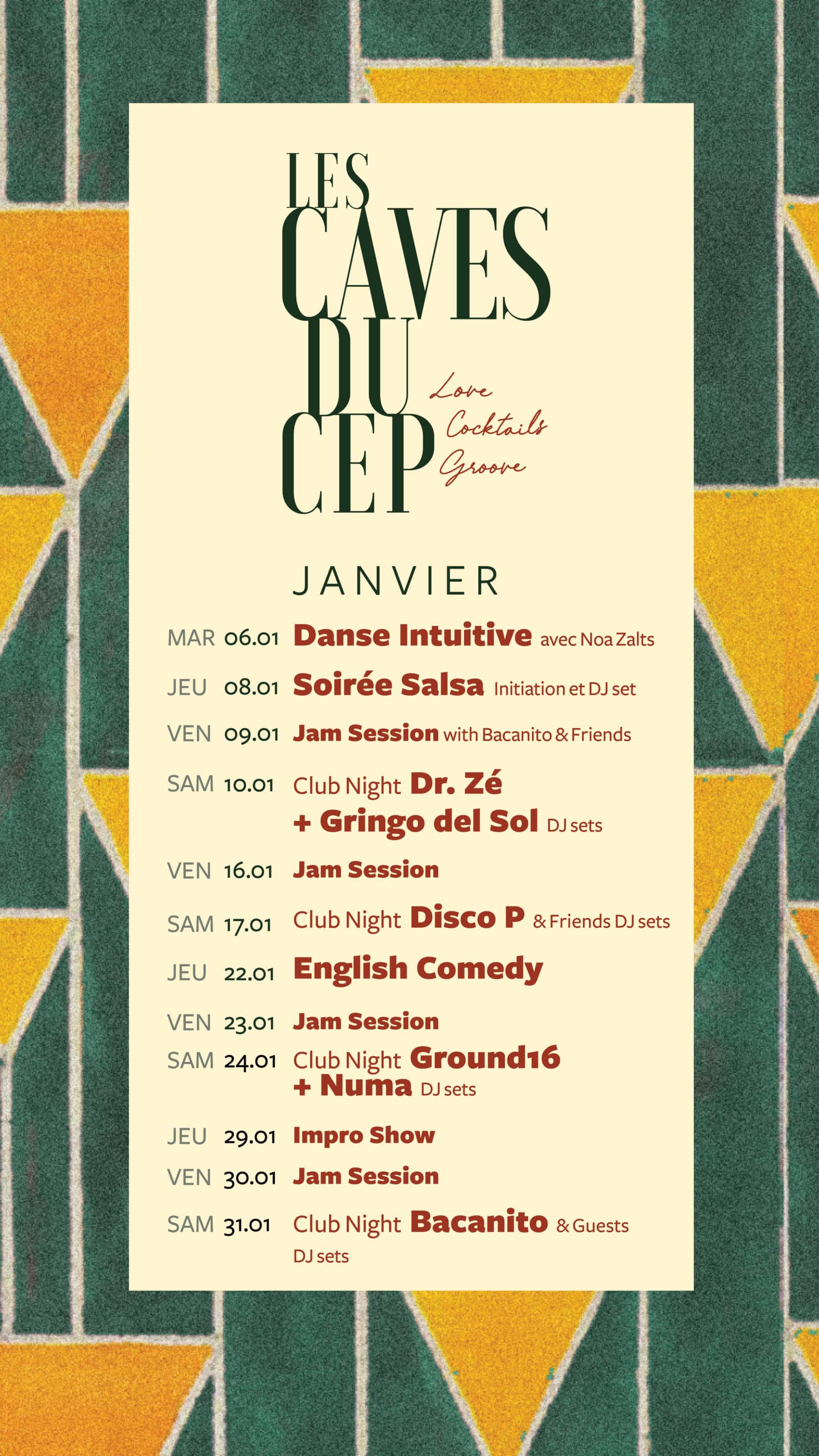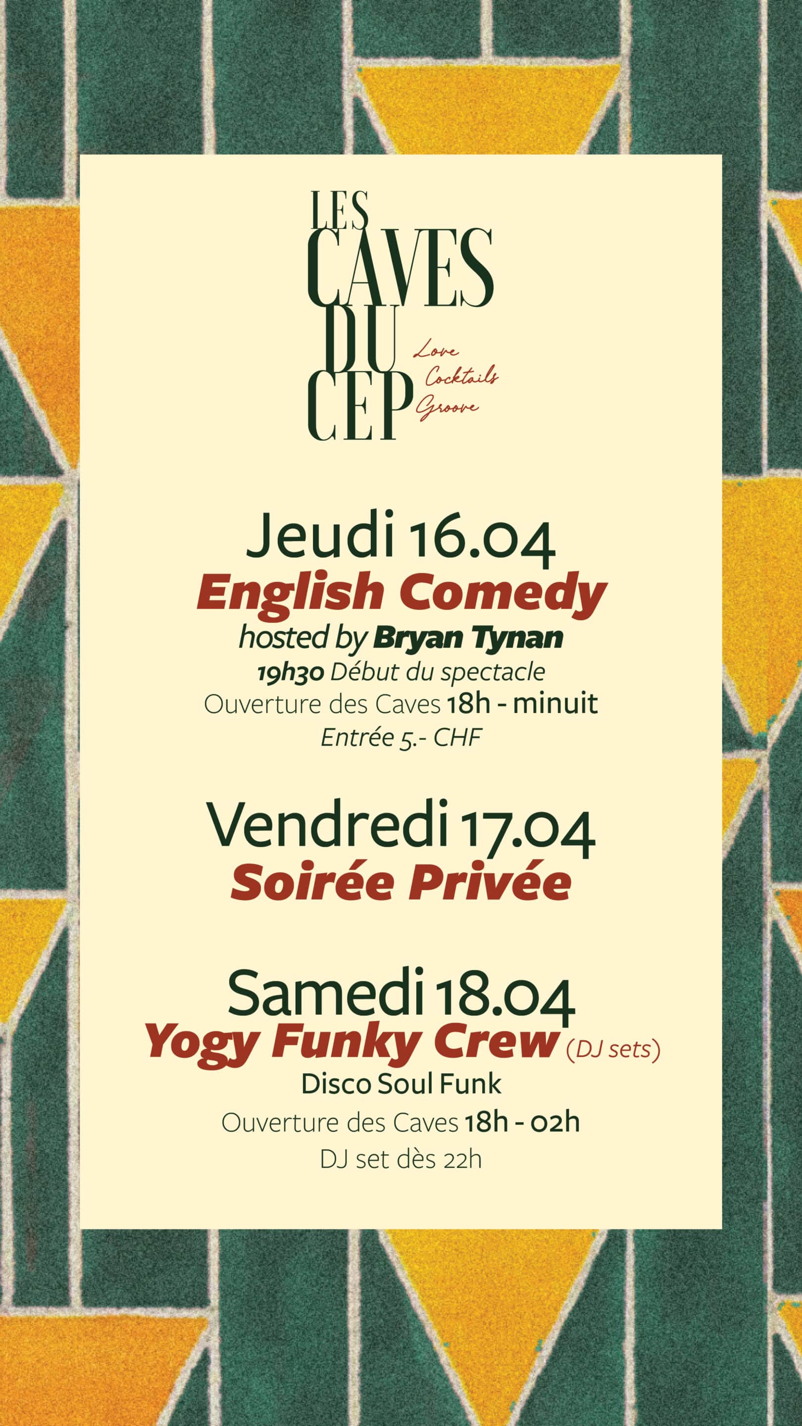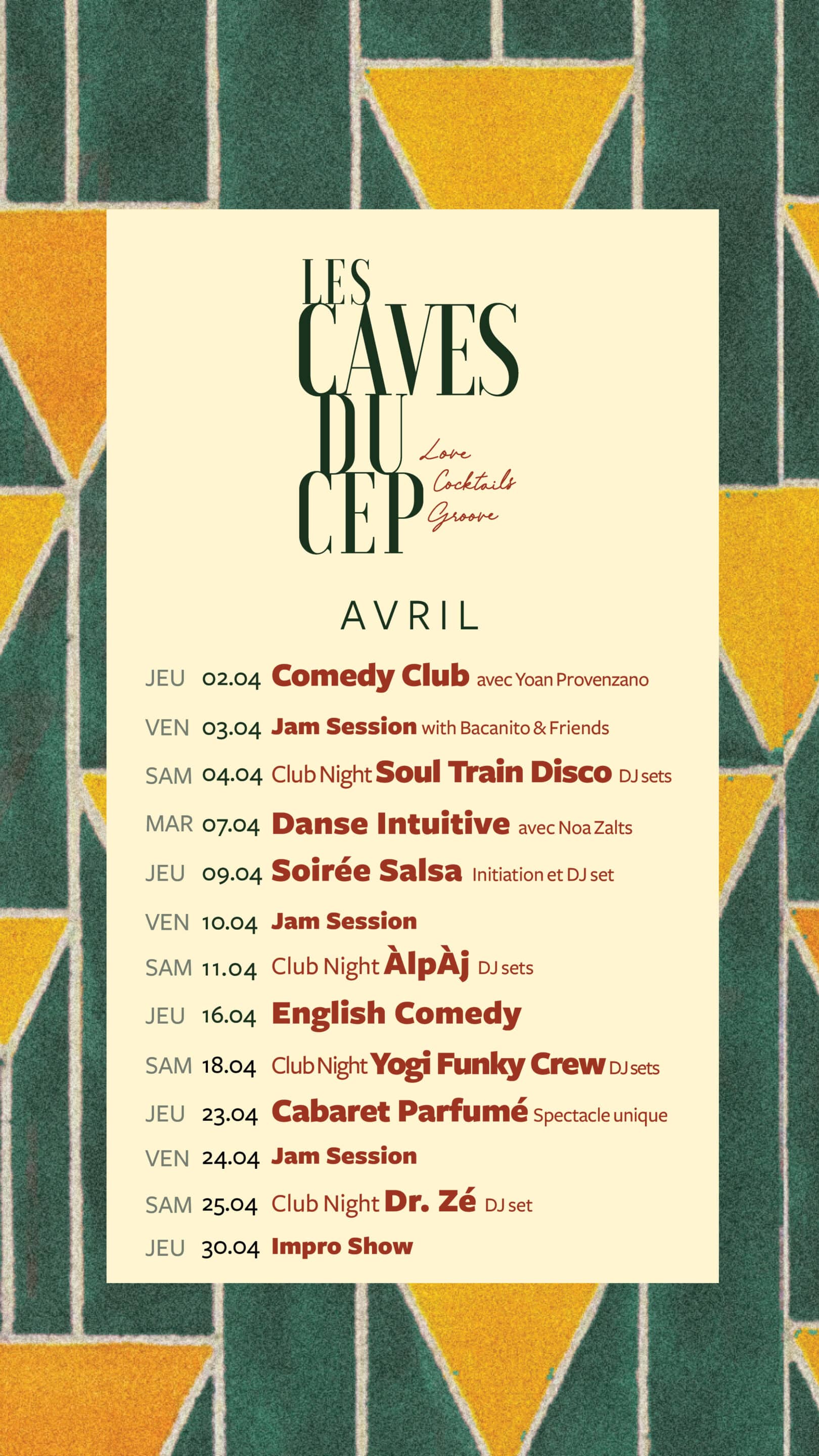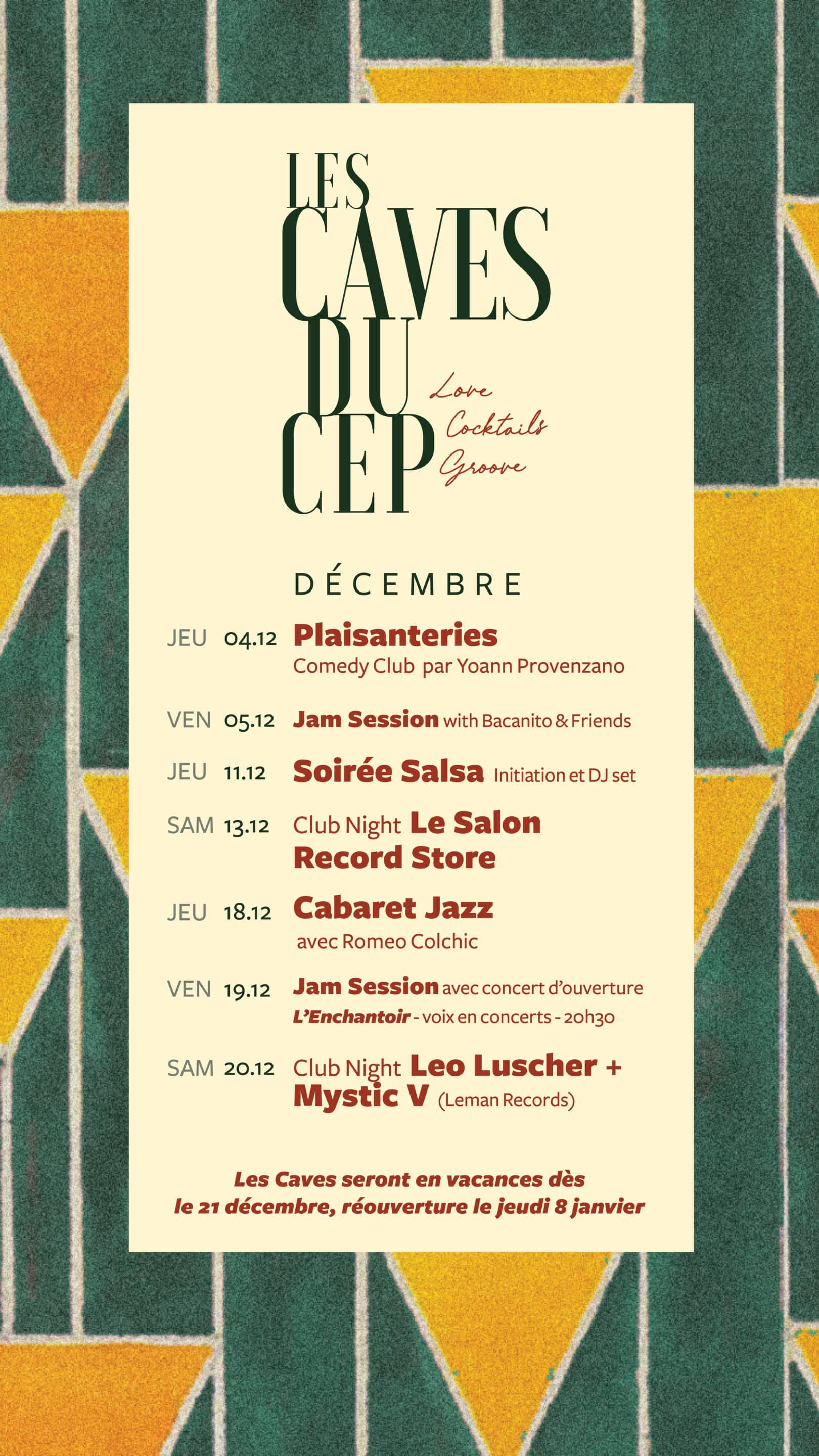 Tous les premiers jeudis du mois, retrouvez PLAISANTERIES, notre Comedy Club mensuel présenté par Yoann Provenzano. Les deuxième jeudis, place à la Salsa, avec un cours d’initiation avant le DJ set. Tous les derniers jeudis du mois ont lieu les Soirées d’Impro. Nous organisons aussi divers ateliers tels que création de bijoux, English Comedy et Cabaret! Suivez les informations ici ou sur notre page Instagram @lescavesducepdorvevey !